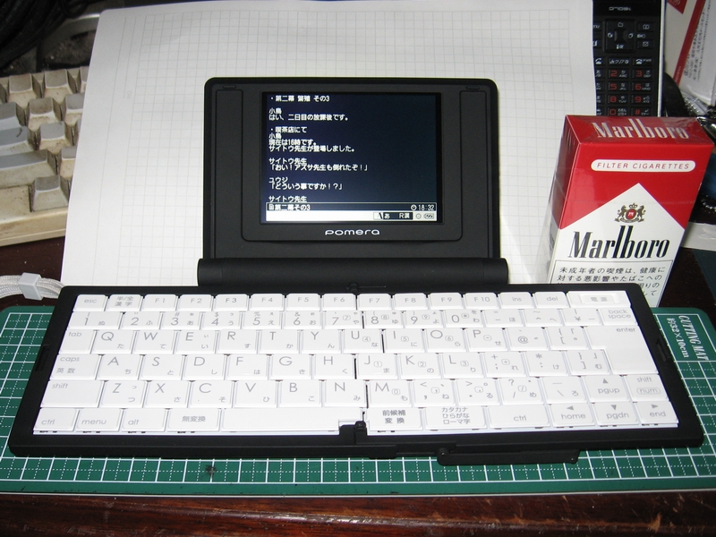 入力してみたりMVpen用のケーブルでつないでPCから読み出してみたり。 あとPCから現在書いている第3幕のシナリオを書き込んでモペラで編集してみたり。 予想以上に良いキーボード。HHKpro無刻印を英語配列で使っている身としては@などの記号位置が違っているのでWindows使いがmacを触っておたおたしてる感覚(の逆版)を味わってみたが3分で感覚を取り戻した。昔はモバギ2を日本語配列で使ってたし。 しっかしこれサクサク動くね。病院の待合室で膝の上で打つというわけにはいかないがテーブルがあるならどこでもシナリオを打てそうだ。 車の中で使えるようにハンドルに引っかける台でもつくろうかな。 とりあえず図書館を<図書館>と変換してくれるように登録しまくります。 技能一覧のテキストを用意するか。