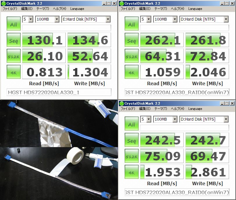 左下が作業工程、右下が施工後。シーケンシャルの速度が落ちているのはデータとページファイルを置いて約240GB程度消費しているからだと思われる。ランダム4kbのRead/Writeで43%程度向上している。ケーブル一つでこんなに違う物だとは驚きである。eSATAケーブルほど速度が向上していないのはドライブの限界とノイズ源の近さ(外付けなので100V電源がケーブルに近いから)であると思われる。